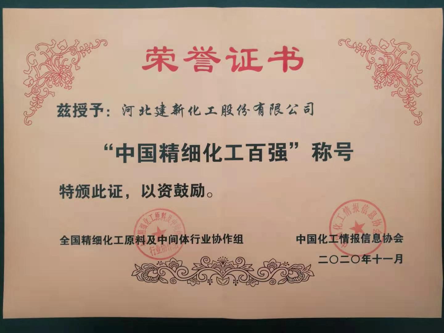 11月25日(ri),2020中(zhong)國(guo)精(jīng)細化工(gong)百(bai)強榜單(dan)在(zai)山(shān)東壽光髮(fa)布。河北建(jian)新(xin)化工(gong)股份有(yǒu)限(xian)公(gōng)司榮獲“2020中(zhong)國(guo)精(jīng)細化工(gong)百(bai)強”。
